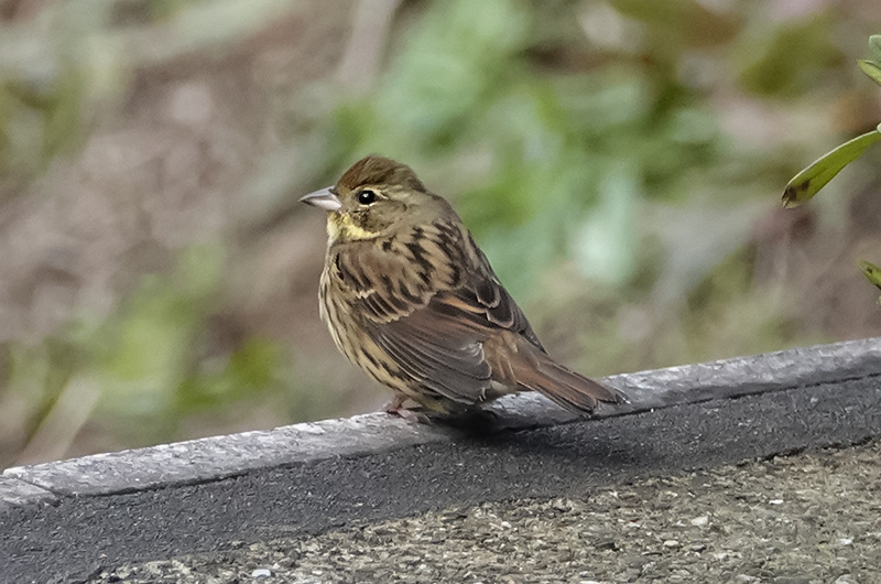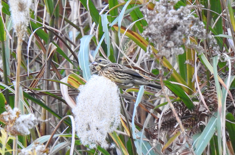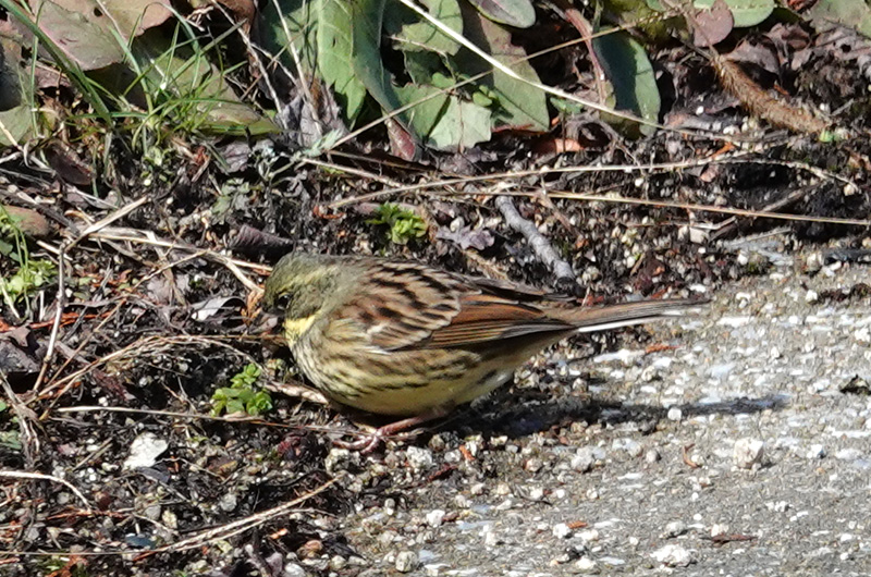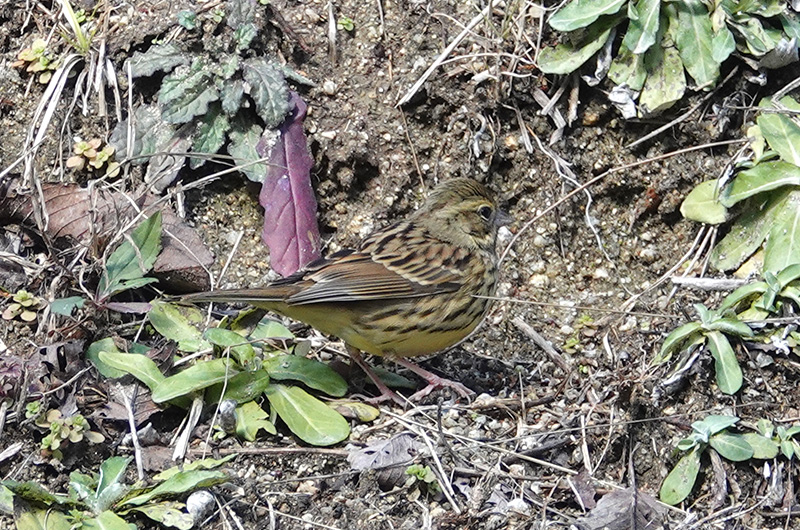 頭からお腹にかけて、淡い黄色をしています。オスは頭が緑色です。 スズメより少し大きい鳥で、地上や低い場所で植物の種や昆虫を食べています。