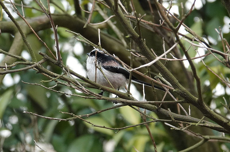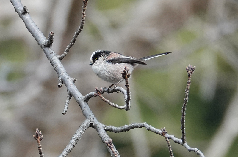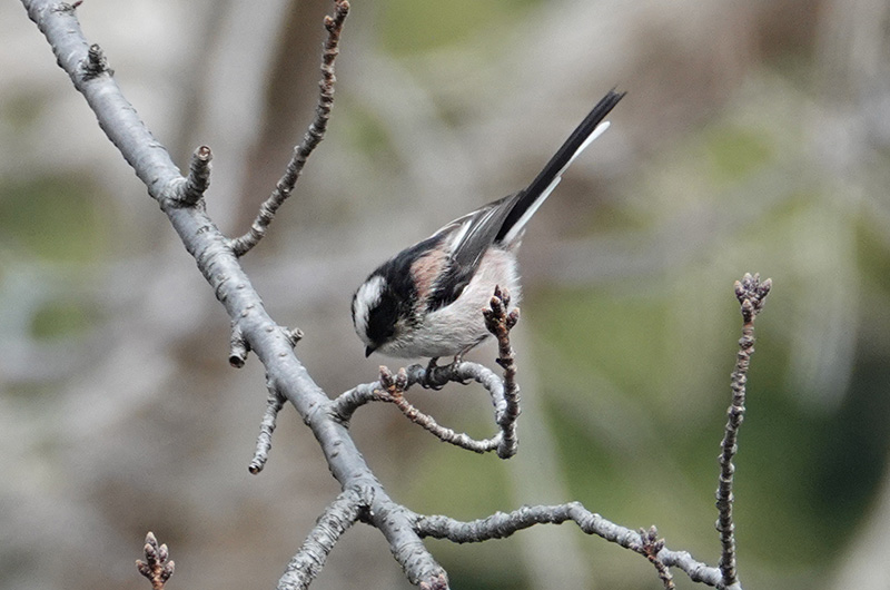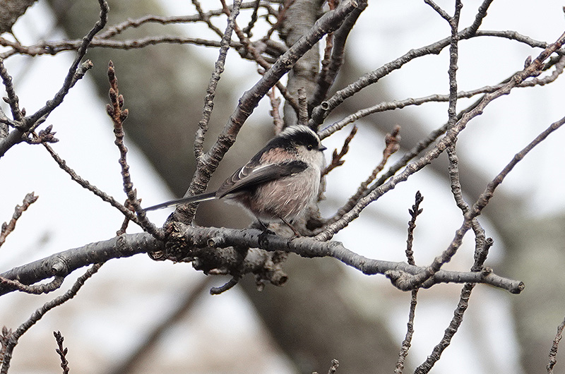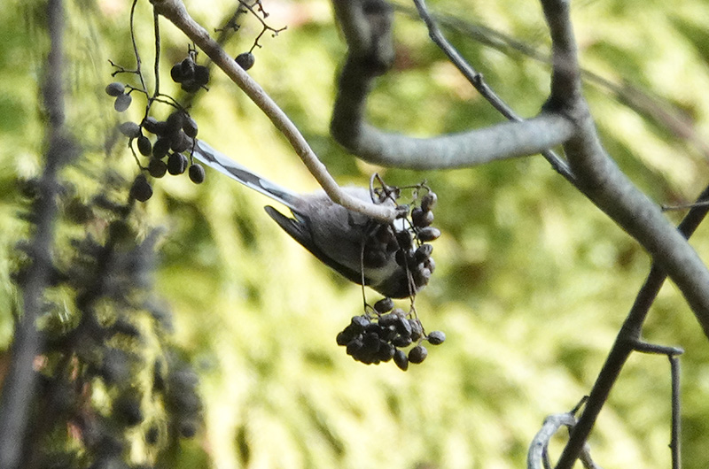 留鳥なので一年中見ることができます。体はスズメより小さいですが、尾羽が長いのが特徴です。 群れで行動していることが多くて、木から木へ移動しながら実を食べています。