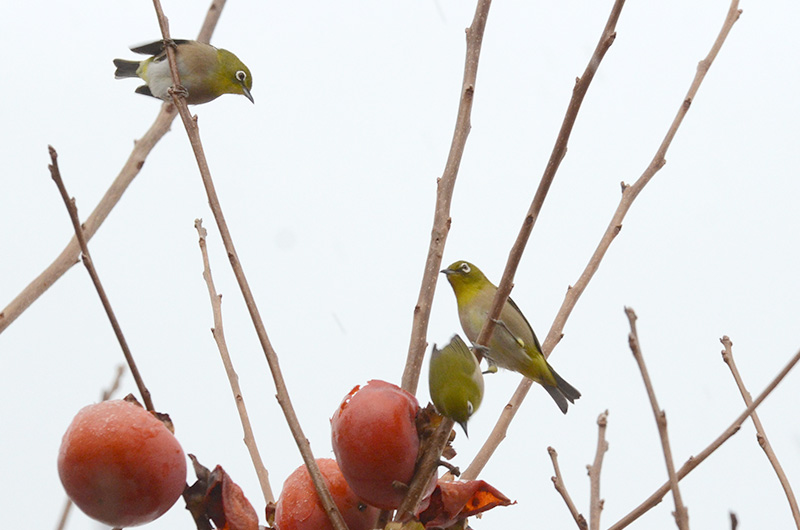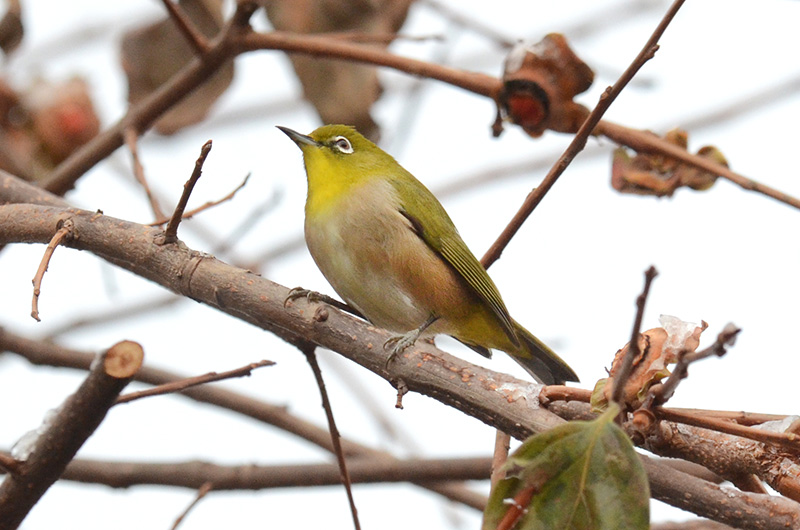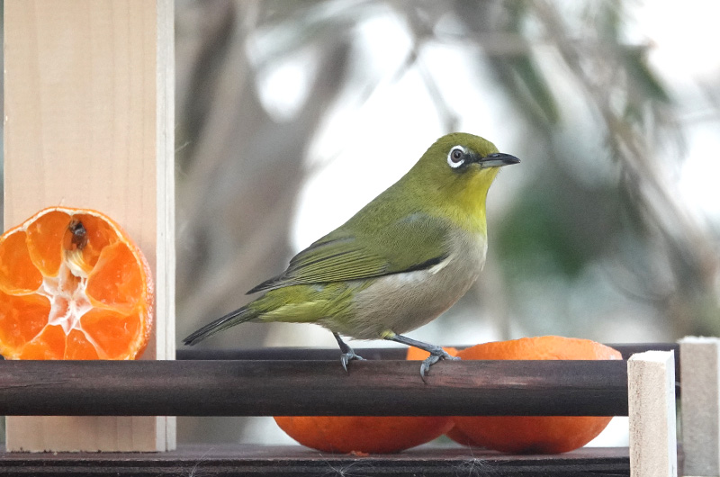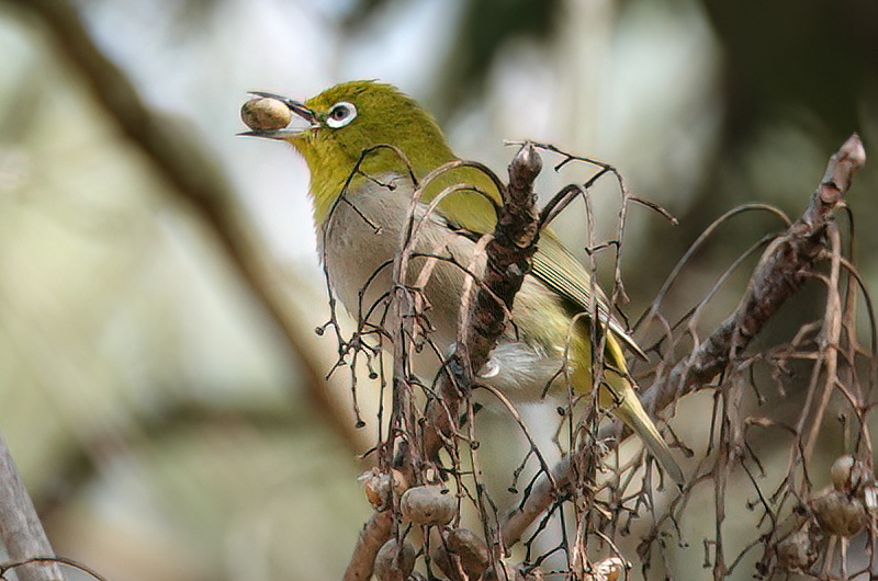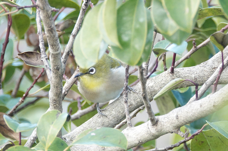 全長12cmでスズメより少し小さいです。黄緑色の体と白いアイリングが特徴です。 集団で行動していることが多く、樹上で木の実をつついている姿をよく見かけます。