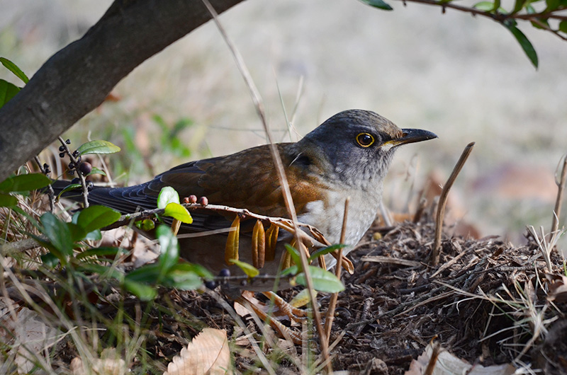 全長24cmくらい。地上にいることが多く、落ち葉をガサガサしてミミズや昆虫を探している姿をよく見かけます。公園や森の中などで見られます。