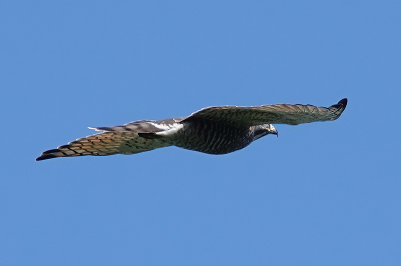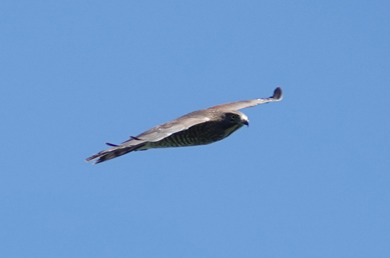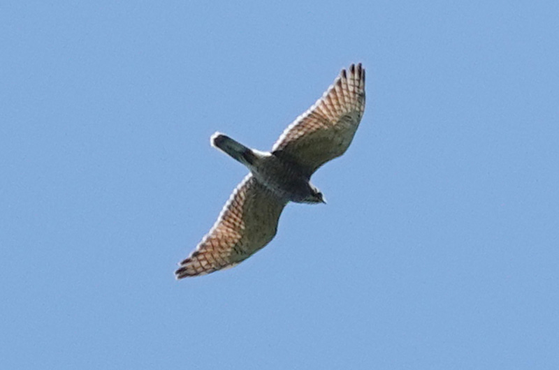 オスは約47cm、メスは約51cmです。翼を広げた開長さは105cm~115cmの猛禽です。 ヘビやカエル、ねずみなどの小動物や昆虫をとらえて食べます。ハチクマと同じように「鷹の渡り」をすることで有名な種です。 ハチクマは毎朝8時~9時頃から飛び立つことが多いですが、サシバは日の出のすぐ後の6時頃から飛び立ちます。渡りの時は柏原校区の上空も通ります。