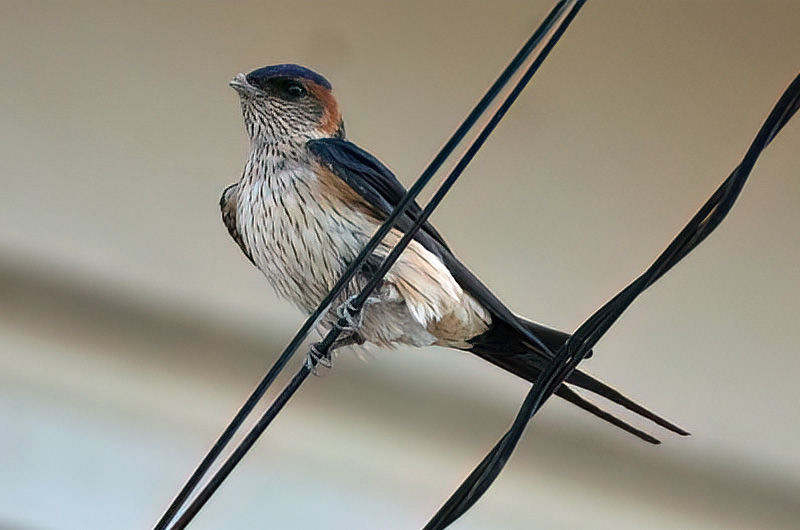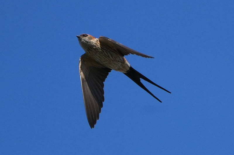全長18.5cm。ツバメよりも少し大きくて、尾が少し長いです。お腹のスジ模様や、腰や頭の赤い模様でツバメと簡単に見分けることが出来ます。生態はツバメと似ていて、空中で虫を捕まえて食べます。